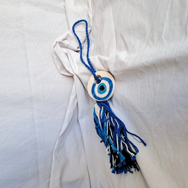 Colgante tejido artesanal con medalla de cerámica, diseño estrellas. Finaliza con un pompón combinado en blanco rojo negro o solo blanco. Largo entre 28 y 30 cm