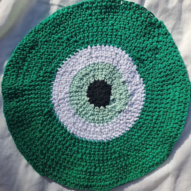 Individuales tejidos a mano con diseño ojo turco en diferentes combinaciones. Verde, rojo, azul, blanco. Diámetro aproximado entre 32 y 35 cm. Ver más detalles