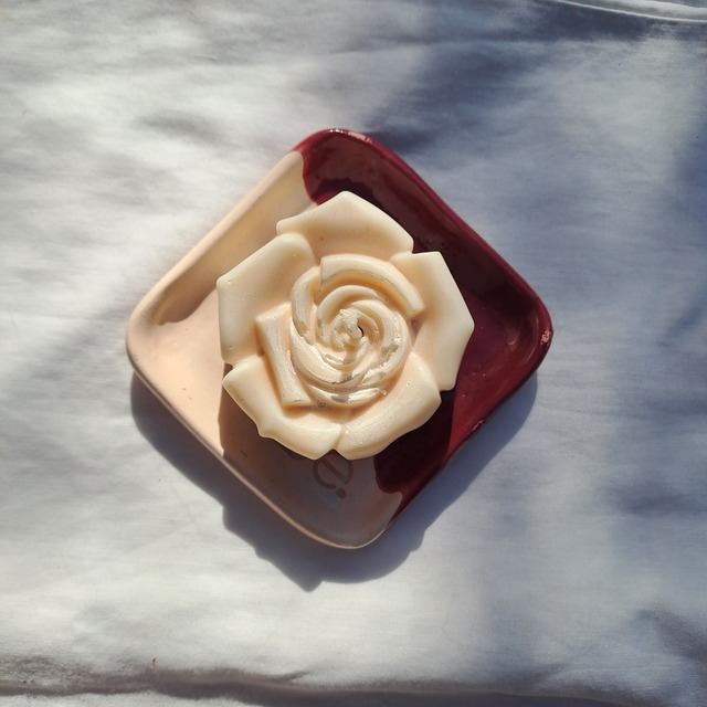 Las velas rosas vienen en aroma Sándalo. También podemos hacer por encargue conversando el aroma que más te resuene. Consultanos por los combos con los platitos.